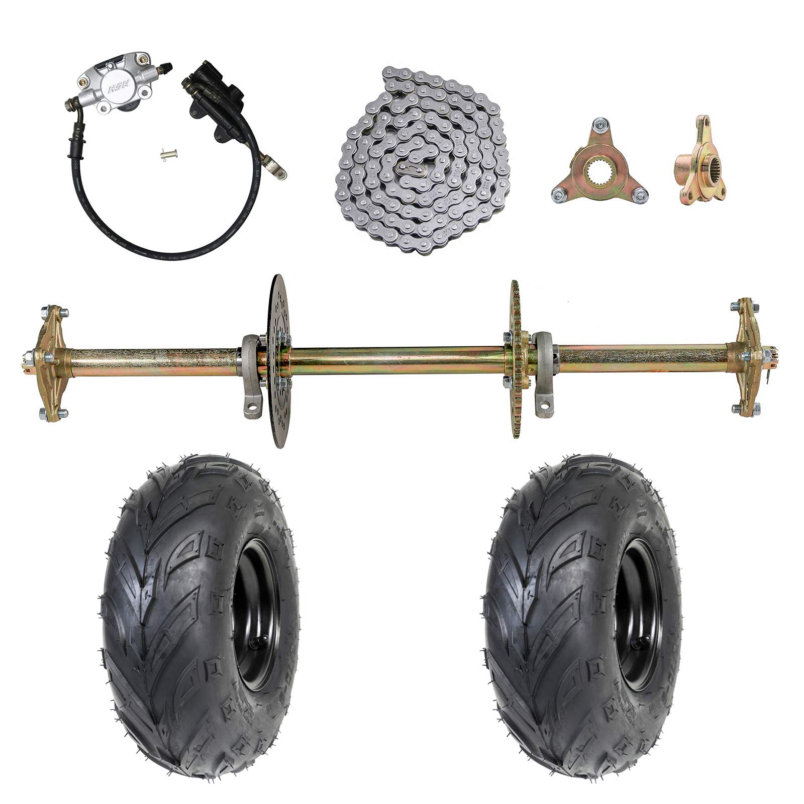 Product Description This is a live axle kit for DIY rebuild Go Kart, Golf Cart, ATV, Quad 4 Wheelers and Drift Trikes Fits 6"-10" wheels with 4 bolt pattern Axle Overall length (from end to end): 1120mm (44") The thickest part of the axle is 33mm (1.3") Chain Sprocket: 530 37 Tooth 58mm Brake Disc Diameter: 220mm(8.66") Spline teeth: 24T Package includes ( just as gallery picture shown. and more! Tire Option: Knobby or Turf tires, specifics are listed below. BMI carries a large inventory of go kart axles and axle accessories